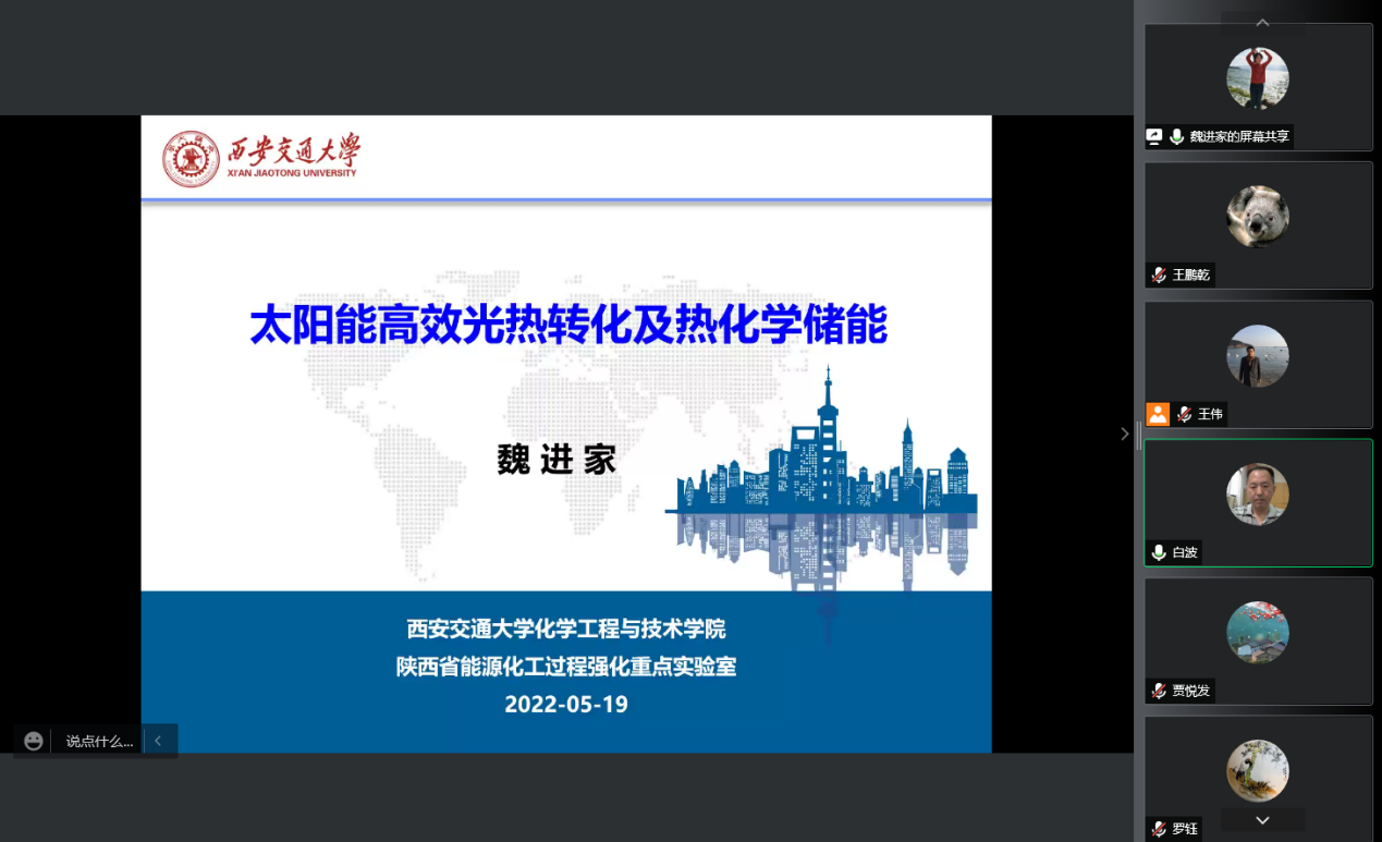 2022年5月19日下午,西安交通大学化学工程与技术学院魏进家教授受邀通过腾讯会议为英国上市公司365的老师和研究生做了“太阳能高效光热转化及热化学储能”的学术报告,报告由学院院长白波主持,学院相关教师和研究生90余人参加了会议。