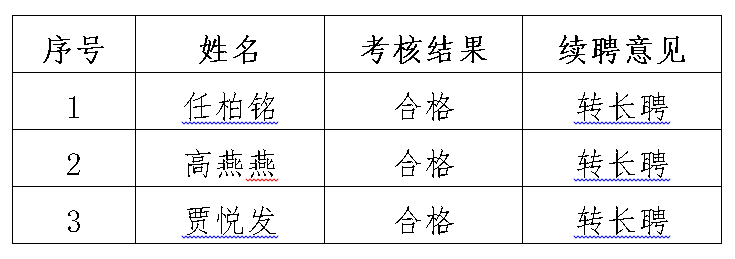 根据《长安大学新进教学科研类人员准聘-长聘管理办法》(长大党〔2022〕84号)文件精神,学校组织开展了2023年第二批准聘制教学科研类人员聘期考核工作。经个人总结、材料审核、学院考核并提出考核结果建议、学校审核,现将学院新进教学科研类人员聘期考核结果及续聘意见(2023年第二批)公示如下: